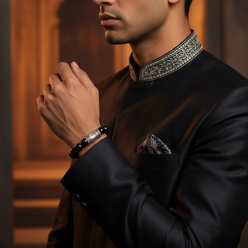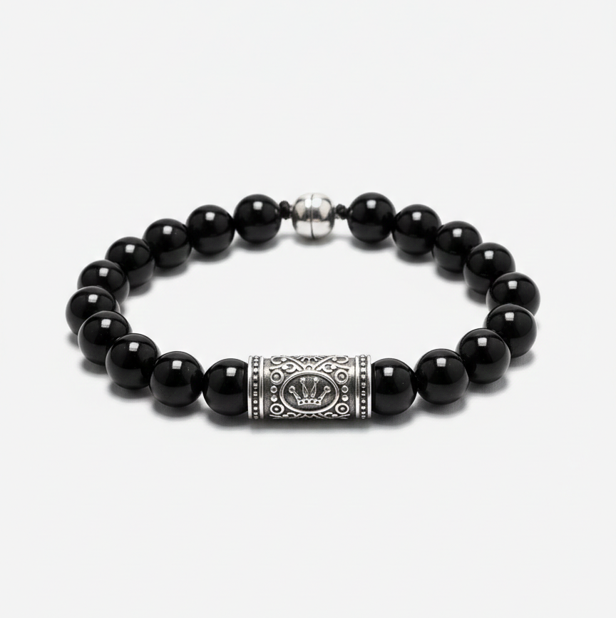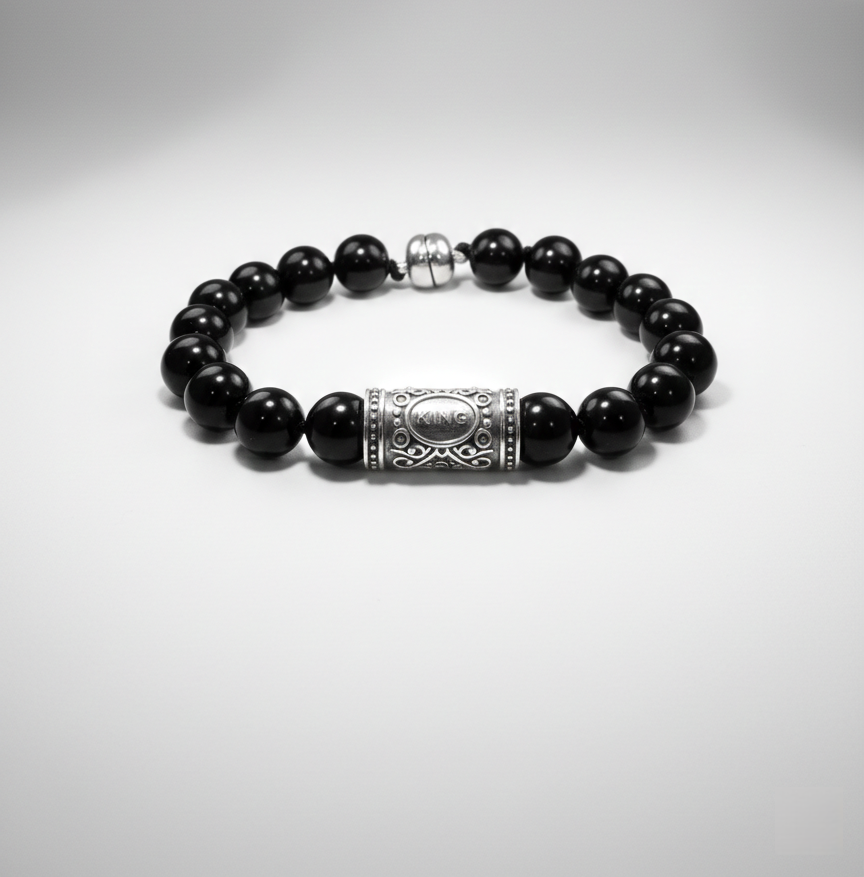 Exude authority and sophistication with this masterfully crafted piece. Featuring high-polish deep black beads and a signature 925 sterling silver cylindrical charm engraved with ‘KING’ and a royal crown, this bracelet is a bold statement of power. Finished with a secure magnetic clasp for effortless luxury.